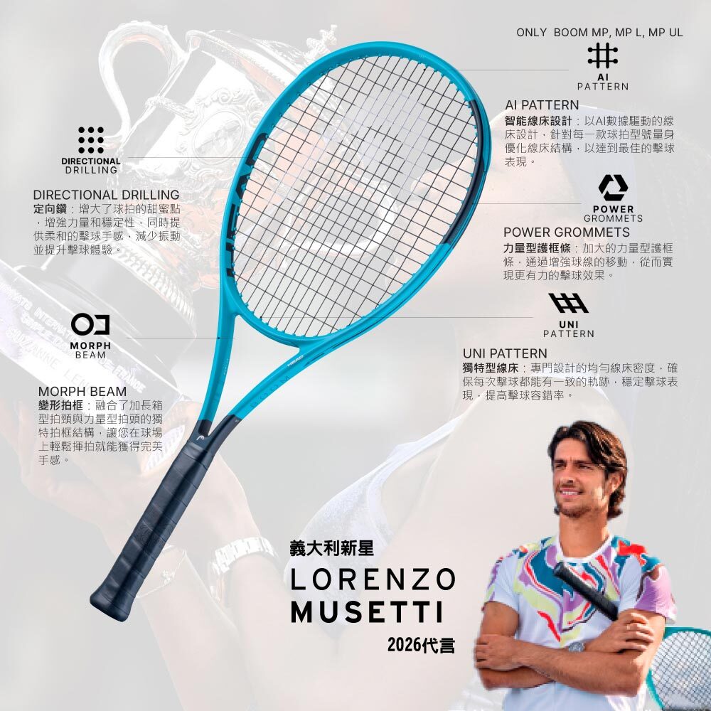 在 HEAD Boom 2026 中,BOOM MP、MP L、MP UL 搭載全新 AI PATTERN 智能線床設計,這不是單純改變線距,而是透過 AI 數據模擬與大量擊球分析,針對不同重量與揮拍特性進行「專屬優化」。