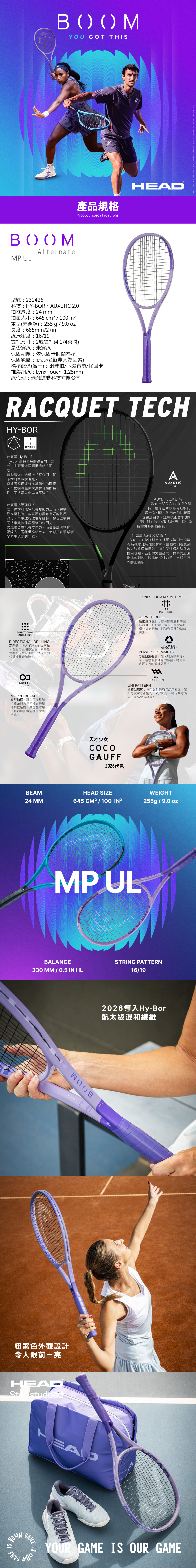 作為 HEAD 最具爆發力的 BOOM 系列的一員,BOOM ALTERNATE 是一款極具彈性的中階拍款,適合中階、進階與賽事球員,尤其是那些希望輕鬆發力並偏好主動進攻風格的球員。