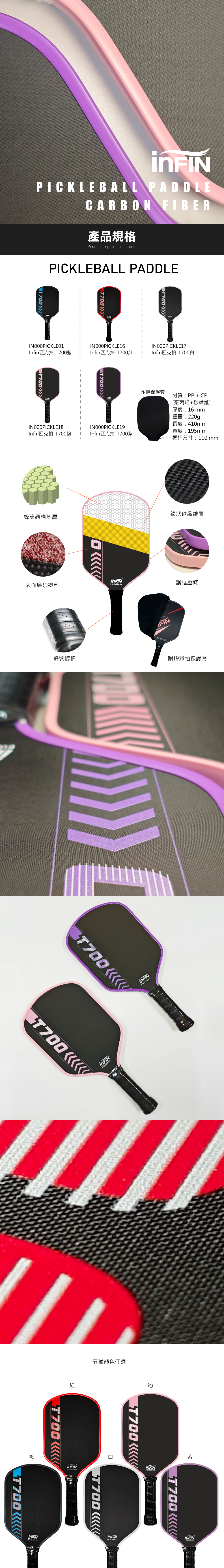 INFIN 匹克球拍採用碳纖維材質,具備輕量化與高強度的特性,專為競技玩家設計。其舒適的握把設計提供卓越的抓握感與減震效果,即使長時間比賽也能保持最佳表現。