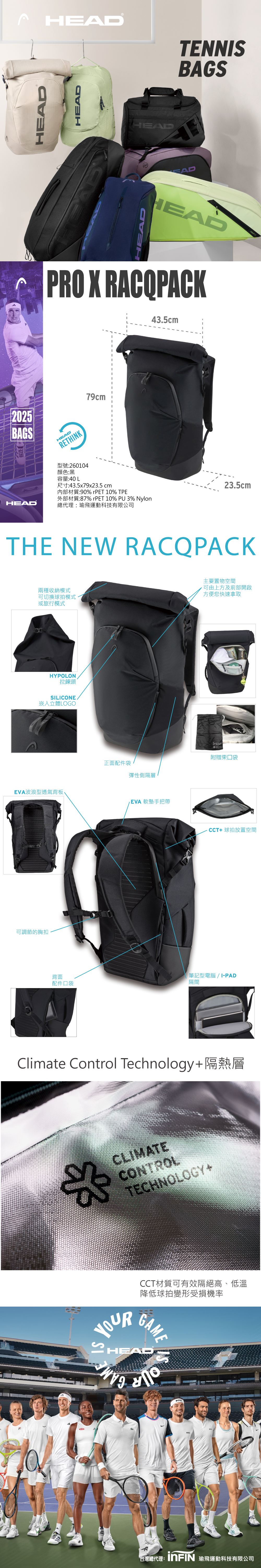 配備 CCT+ 氣候控制技術的球拍隔層,可保護最多 3 支球拍