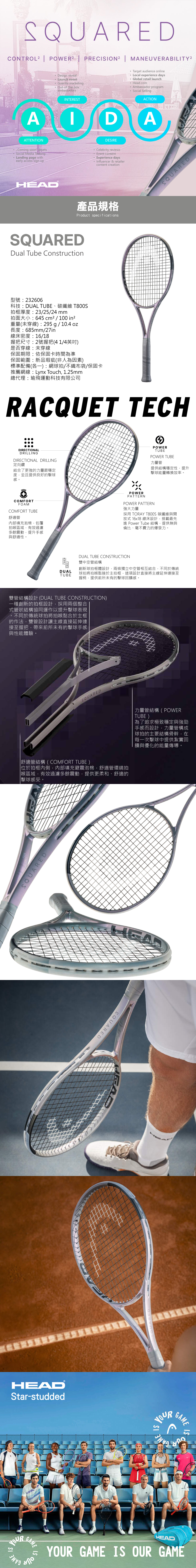 SQUARED 的創新程度之高,以至於在市場上開創了一個全新的類別:超低平衡點球拍,適合各年齡與各等級的球員,追求力量與舒適度的完美融合。SQUARED 帶來力量²、靈活度² 與舒適度²。這是 HEAD 有史以來最輕頭的球拍,擁有極佳的手感與操控性,讓你能自信揮拍,執行乾淨而精準的擊球技術。經證實能減少揮拍時的肌肉活動,特別適合尋找護臂球拍的球員。與大多數僅有單管結構的球拍不同,SQUARED 採用最先進的雙管科技:外管使用東麗 Torayca™ T800S 碳纖維,提供力量;內管填充泡棉,最大化舒適度、護臂效果並帶來清脆的擊球手感。