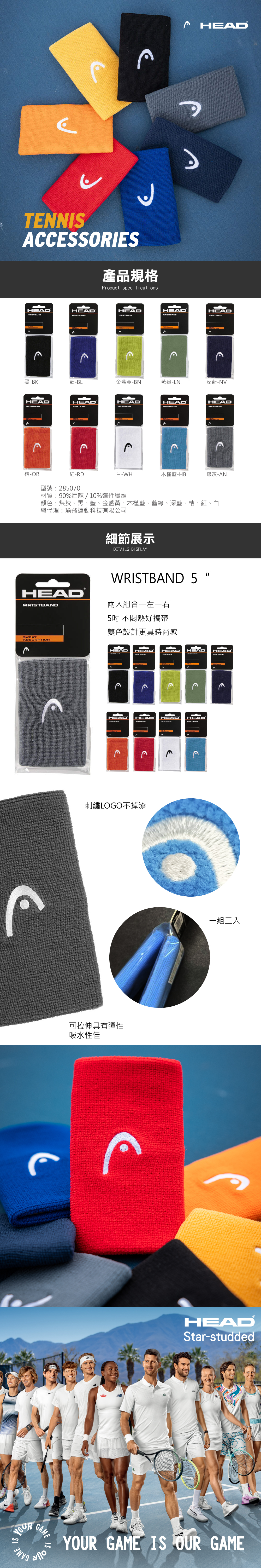 HEAD WRISTBAND 5" 吸汗護腕是運動必備配件,專為比賽和日常訓練設計。腕帶由90% 尼龍與10% 彈性纖維製成,具備良好的彈性與吸汗功能,幫助您在炎熱天氣保持臉部乾燥,保持最佳運動表現。