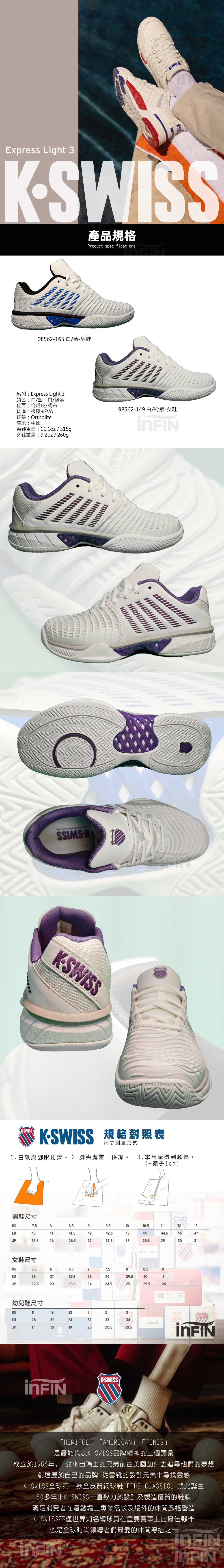 K-SWISS Express Light 3 透氣輕量網球鞋,主打「快、穩、耐」。鞋面採合成皮+網布,透氣不悶、上腳輕盈(男鞋約315g)。鞋頭 DRAGGUARD 與 Durawrap 耐磨補強,應付頻繁急停滑步更安心;180 PSC 中足支撐提升穩定性,後跟止滑內裡牢牢鎖定不鬆脫。搭配 Ortholite 鞋墊與橡膠+EVA 鞋底,回彈舒適、抓地可靠。