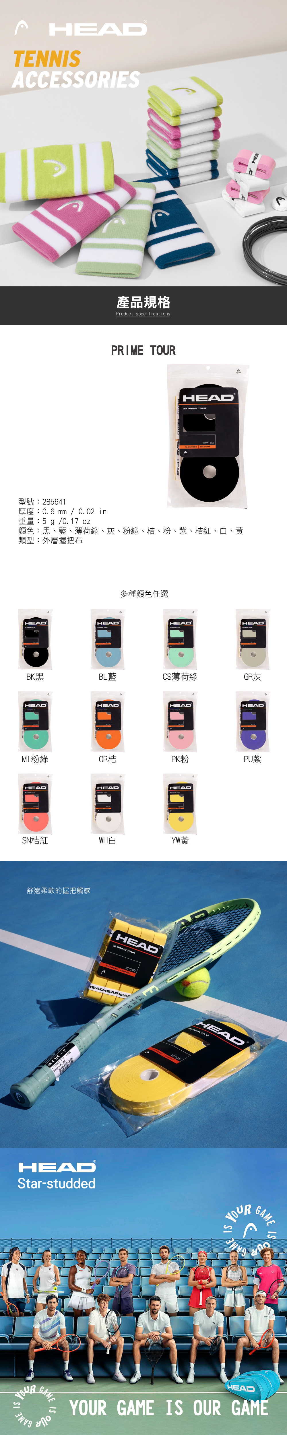 Prime Tour 握把布結合了舒適與黏性,為球員提供柔和的觸感。由特殊微小分子組成,是 HEAD 最暢銷的外層握把布之一,適合長時間的比賽與訓練使用,提供高性價比的選擇。