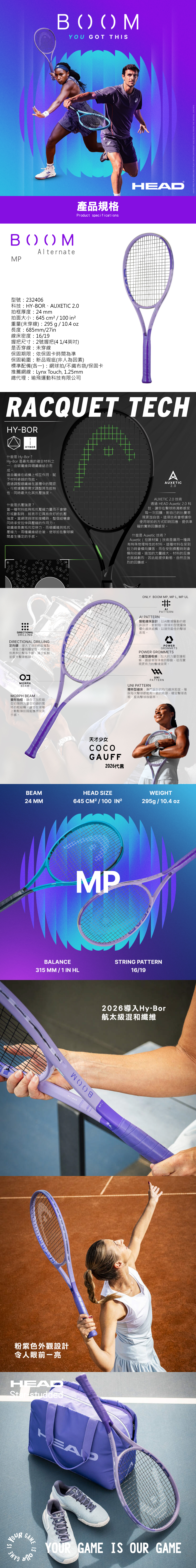 作為 HEAD 最具爆發力的 BOOM 系列的一員,BOOM ALTERNATE 是一款極具彈性的中階拍款,適合中階、進階與賽事球員,尤其是那些希望輕鬆發力並偏好主動進攻風格的球員。
