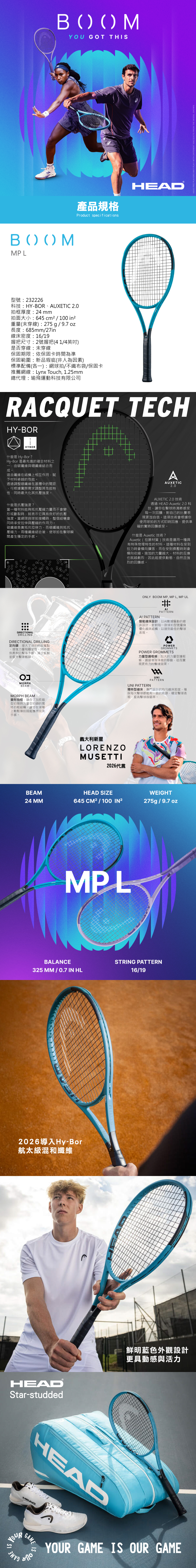 BOOM 系列是 HEAD 網球拍中最具爆發力的產品線之一,此款 MP L(中階重量款)為多功能機型,適合追求輕鬆發力或偏好主動進攻的球員使用。